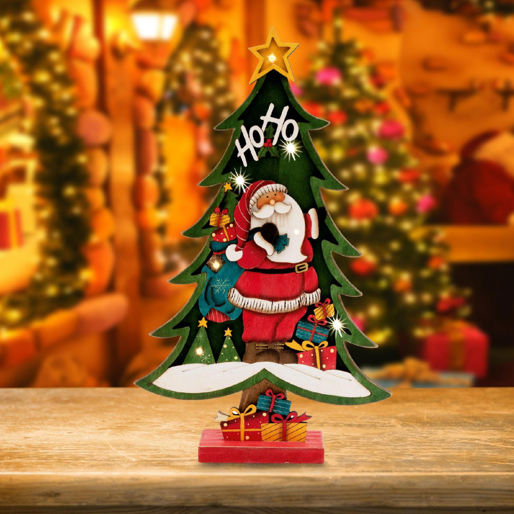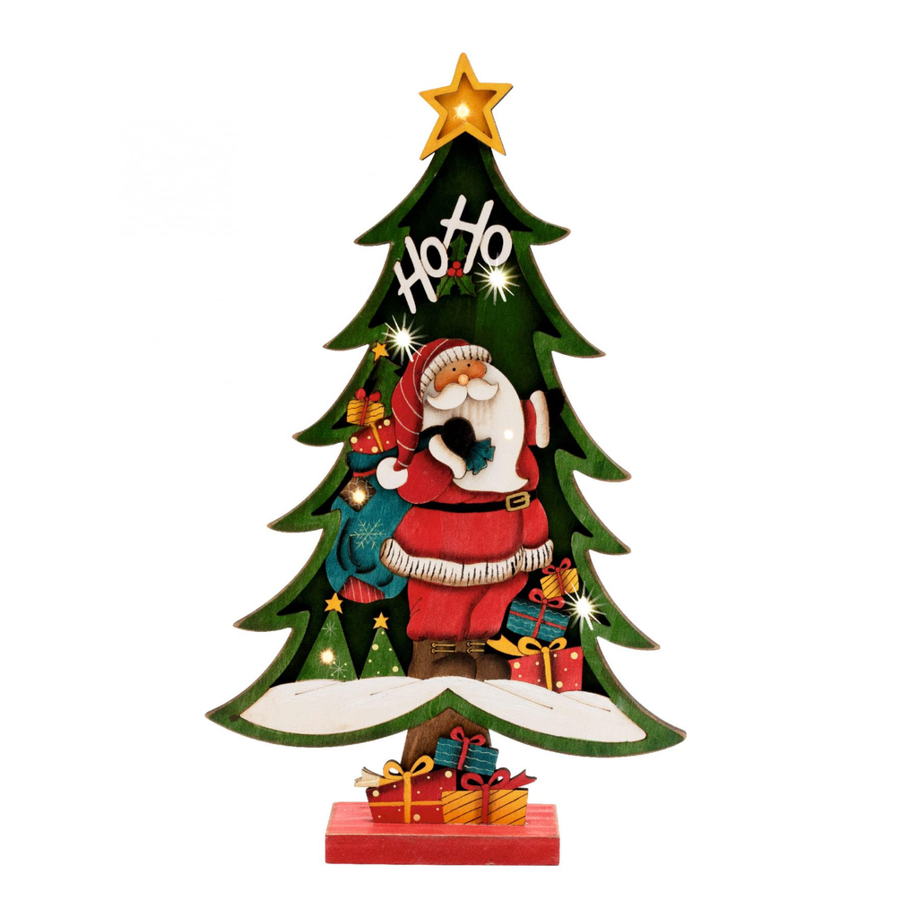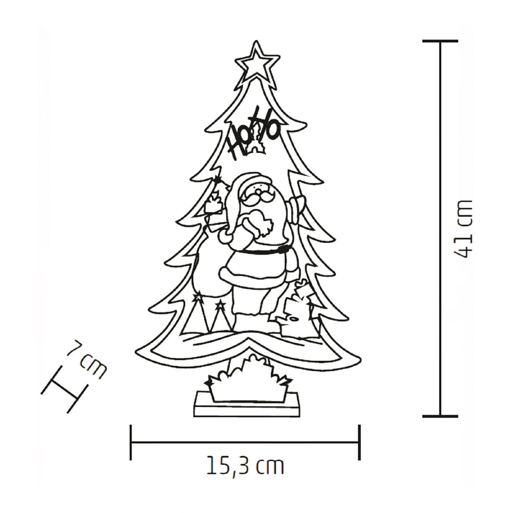 LED-es zöld fenyő asztali dekoráció, festett fa anyagból, 7 db melegfehér állófényű LED-del. Termékünk fa talppal rendelkezik, így elhelyezése csak Önön, a fantáziáján és a lehetőségein múlik!