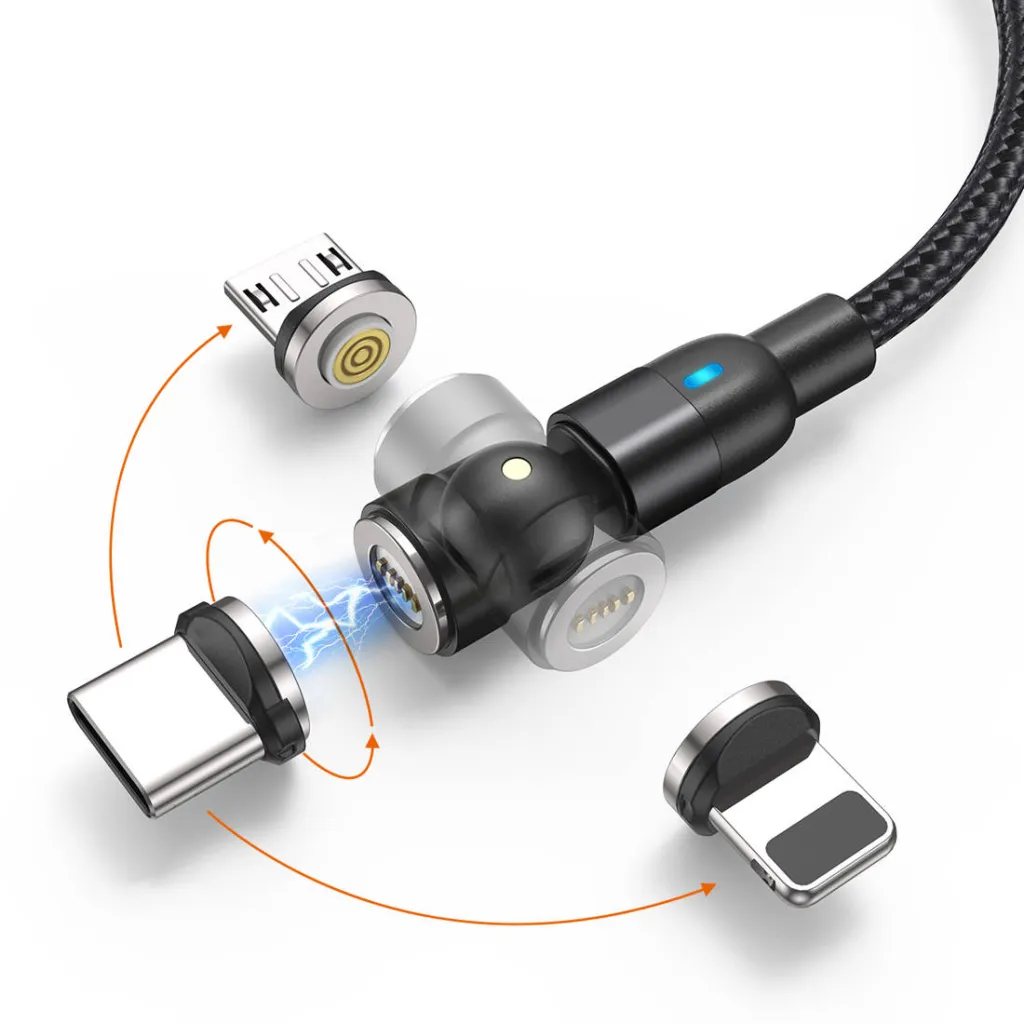 Mágneses kábel 3 az 1-ben 3A 1 m USB - USB-C + iPhone Lightning + Micro USB (állítható szög) fekete