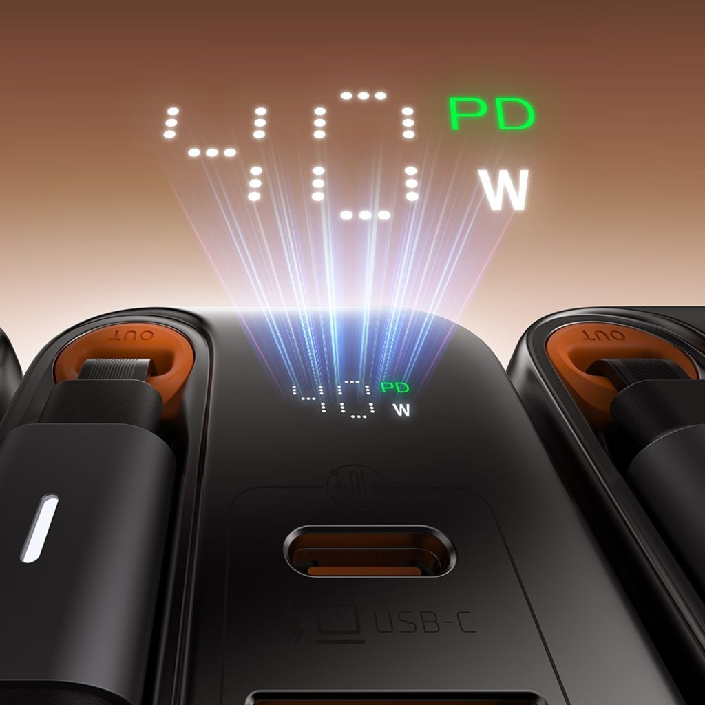 - Beépített, visszahúzható USB-C kábel: Nincs többé szükség külön kábelre a legfontosabb eszközeinek töltéséhez. A 65 cm hosszú, tartós kábel könnyedén kihúzható és visszahúzható, rendezetté téve a töltést.