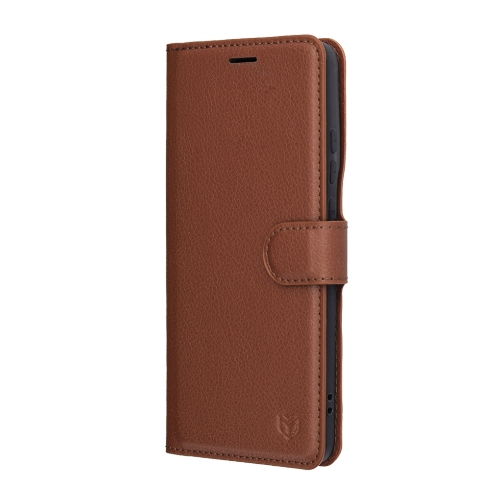 - Kifinomult design és anyaghasználat: A tok kiváló minőségű, texturált barna műbőrből készült, amely kellemes tapintású és időtálló megjelenést biztosít telefonjának. A Techsuit logó finoman jelzi a márka minőségét.