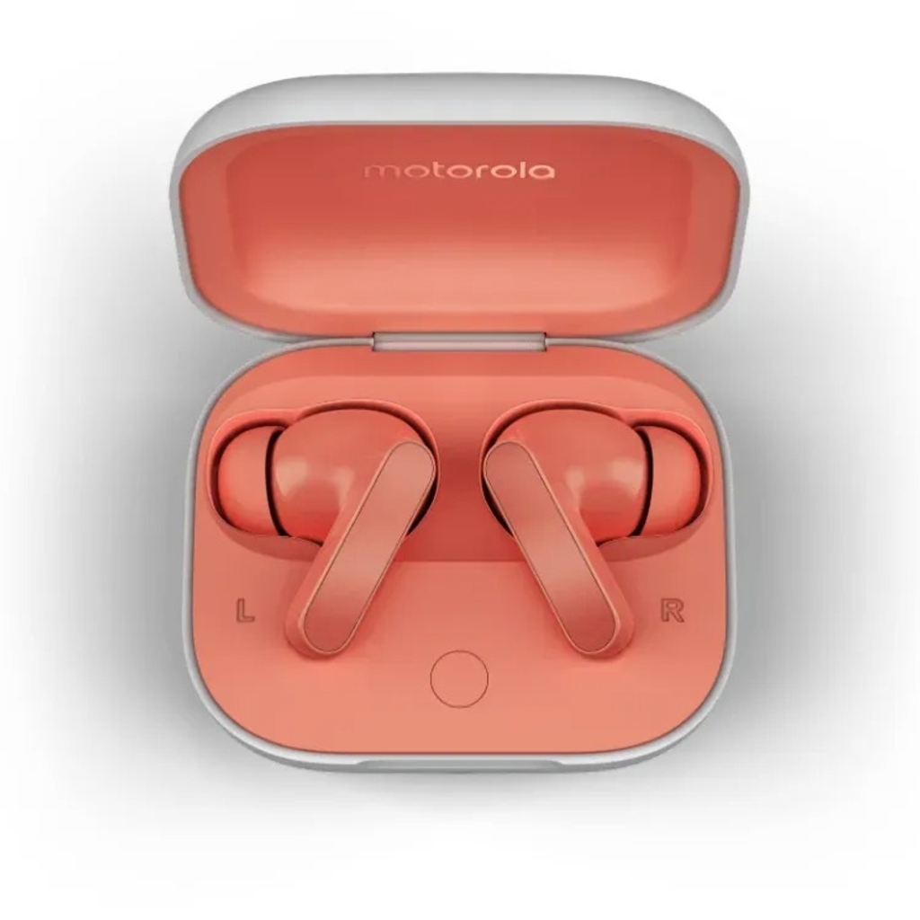 A "Peach Pink" árnyalatú fülhallgató és a töltőtok belseje azonnal magával ragadja a tekintetet, egyediséget és frissességet sugározva. A kompakt, lekerekített sarkú töltőtok elegáns, törtfehér külső borítást kapott, amelyet a Motorola ikonikus logója díszít, modern és letisztult megjelenést kölcsönözve. Az ergonomikus in-ear kialakítás és a puha szilikon fülpárnák hosszantartó kényelmet biztosítanak, így órákon át élvezheti kedvenc zenéit vagy hívásait fáradtság nélkül. A fülhallgató száras kialakítása nem csak esztétikus, de stabil illeszkedést is garantál, a tokban található "L" és "R" jelölések pedig megkönnyítik a helyes behelyezést.