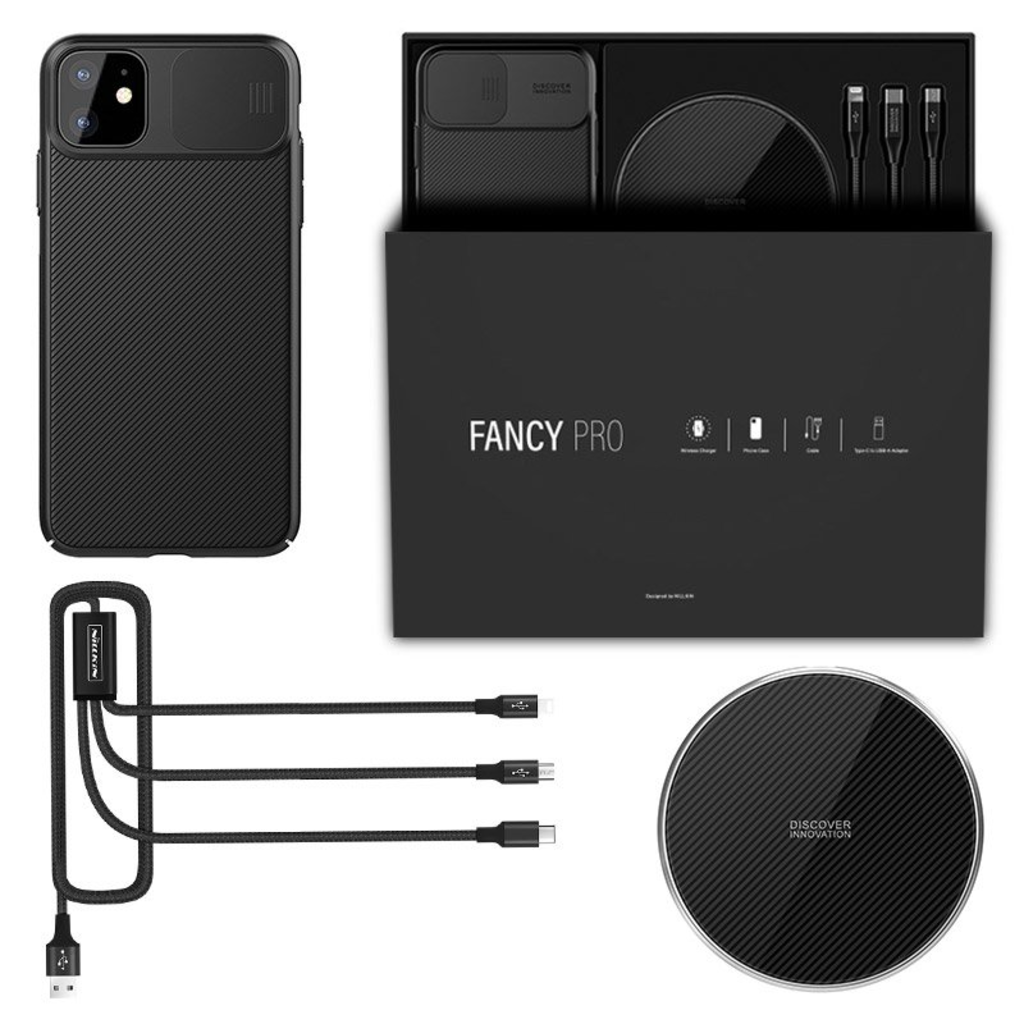 Vezeték nélküli töltő+ iPhone 11 Pro tok + 3in1 kábel fekete Nillkin Fancy Pro ajándékszett