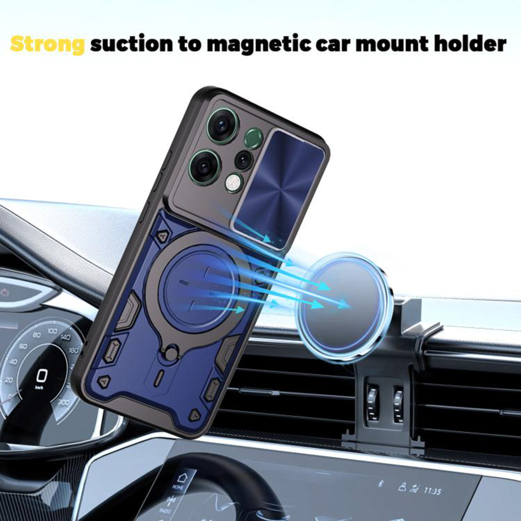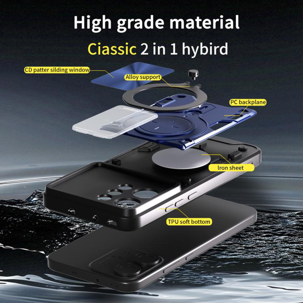 A tok hátoldalán található grand metal kitámasztó gyűrű nemcsak stílusos, hanem rendkívül sokoldalú. A robusztus ötvözet tartónak köszönhetően 360°-ban elforgatható és 180°-ban állítható, így könnyedén beállíthatja a legideálisabb látószöget videónézéshez, böngészéshez vagy videóhívásokhoz. Kényelmes és biztonságos fogást biztosít, minimalizálva a véletlen leejtések kockázatát. Emellett a beépített vaslemeznek köszönhetően a tok erősen tapad a mágneses autós tartókhoz, így telefonja stabilan és biztonságosan rögzíthető vezetés közben.