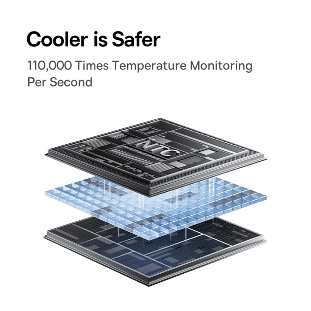 A Baseus számára a biztonság kiemelt fontosságú. Az EnerFill FC31 Qpow 3 fejlett NTC hőmérséklet-felügyeleti rendszerrel van ellátva, amely másodpercenként 110 000 alkalommal ellenőrzi a készülék hőmérsékletét, így garantálva a biztonságos és stabil töltést minden körülmények között. A "Hűvösebb = biztonságosabb" elv alapján ez a technológia megóvja eszközeidet a túlmelegedéstől és meghosszabbítja az akkumulátor élettartamát.