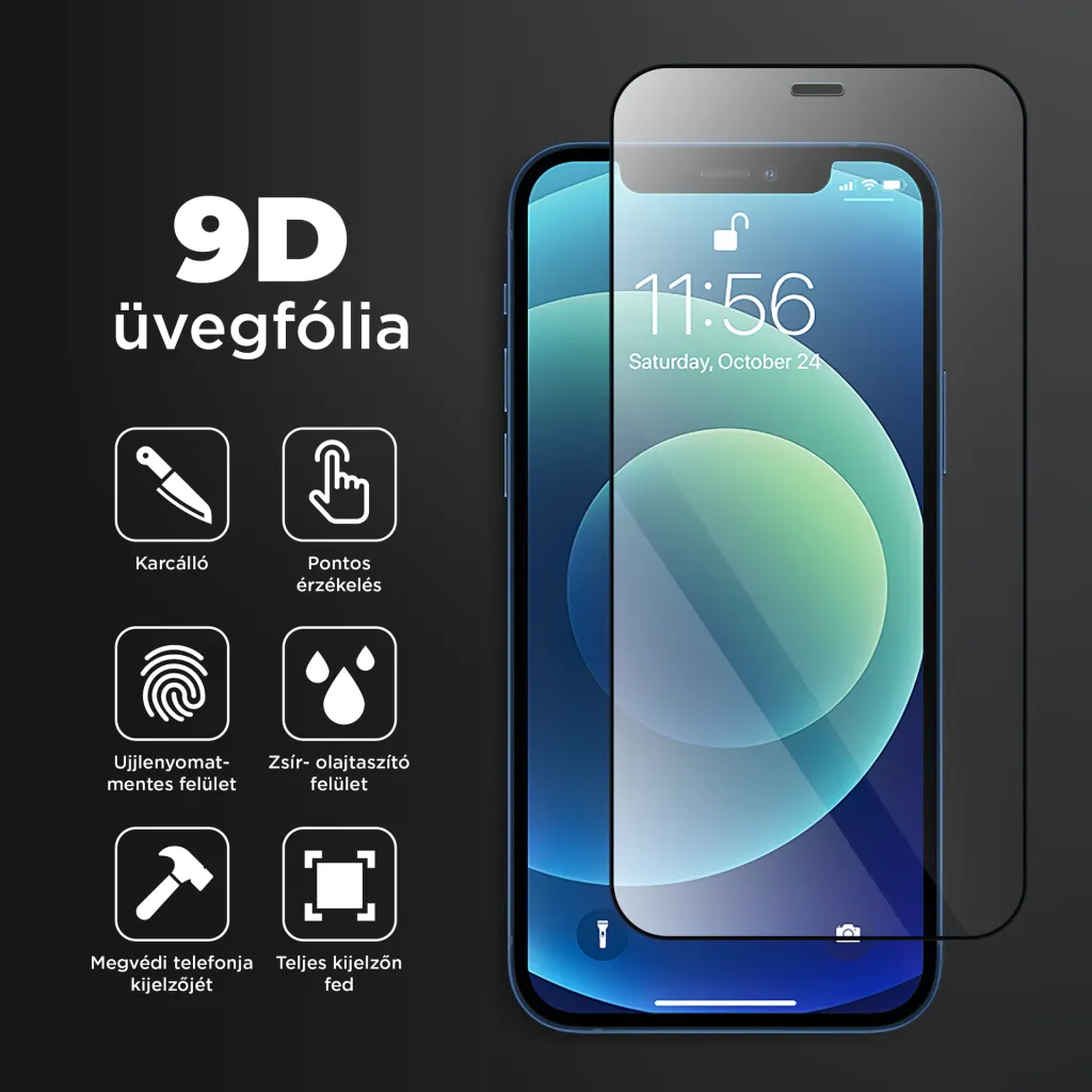 Minőségi 9D 0.33mm 9H fekete keretes, teljes felületén ragasztott üvegfólia.