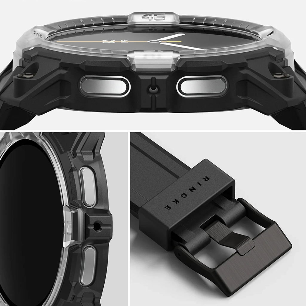 A Ringke Rugged Gear tokot úgy tervezték, hogy a legmagasabb szintű tartósságot nyújtsa. Kettős anyagú konstrukcióval készült: a kemény polikarbonát (PC) réteg ellenáll a karcolásoknak és ütéseknek, míg a rugalmas TPU (hőre lágyuló poliuretán) anyag elnyeli az ütéseket és tökéletesen illeszkedik az óra köré. Ez a kombináció garantálja az óra átfogó védelmét a mindennapi használat és a kalandok során egyaránt.