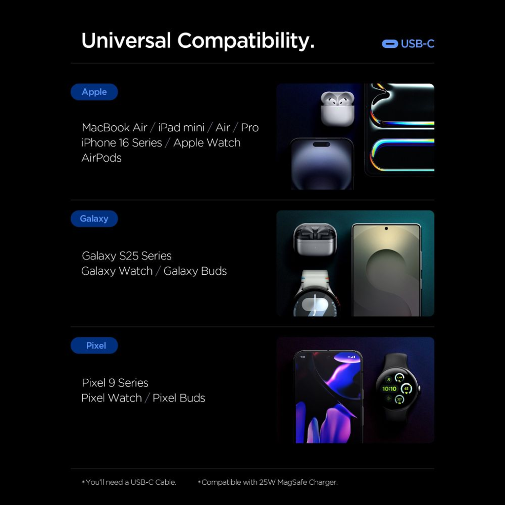 - Apple: MacBook Air / iPad mini / Air / Pro, iPhone 16 Series, Apple Watch, AirPods. (Kompatibilis a 25W MagSafe töltővel.)