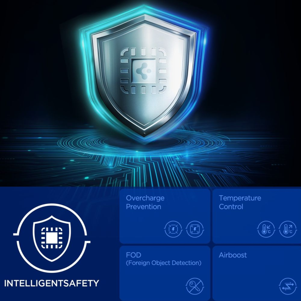 A Spigen kiemelt figyelmet fordít a biztonságra. A beépített FOD (Foreign Object Detection) rendszer azonnal felismeri a töltési zónában lévő fémes vagy nem kívánt tárgyakat, megelőzve a potenciális veszélyeket. A túltöltés elleni védelem megóvja telefonja akkumulátorát a károsodástól, meghosszabbítva annak élettartamát. A folyamatos hőmérséklet-felügyelet és az AirBoost garantálja a biztonságos és stabil 25W-os gyors vezeték nélküli töltést.