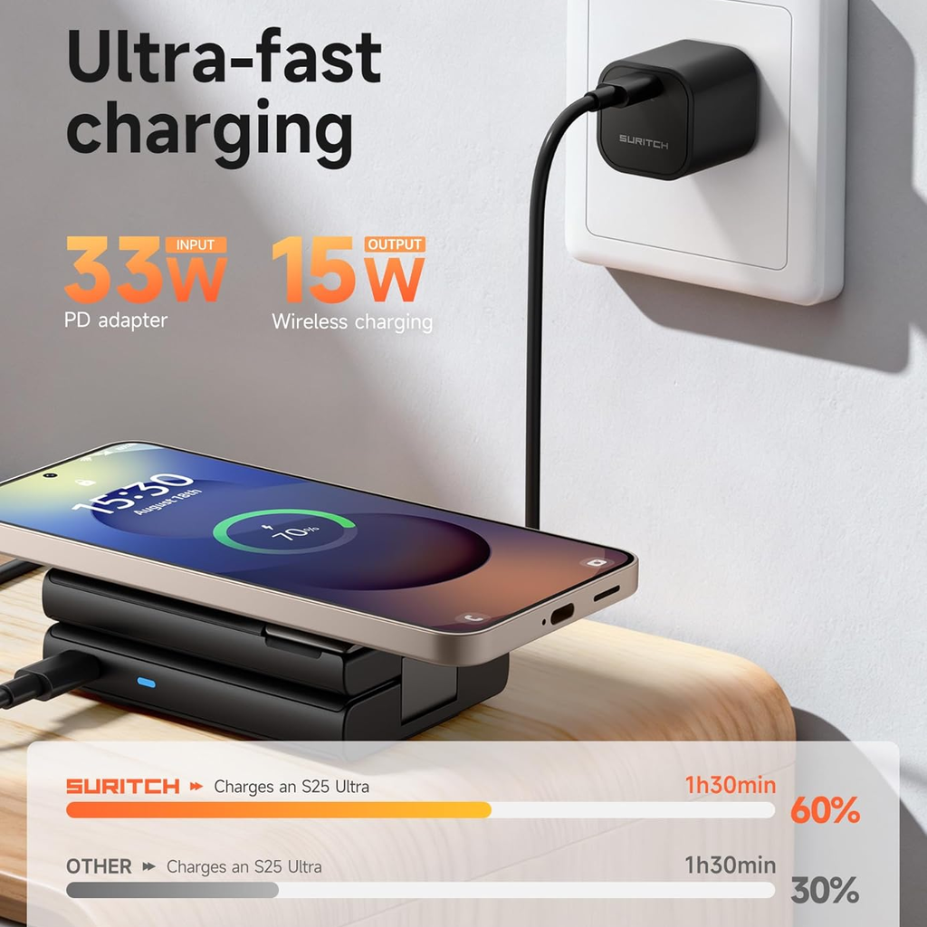 - A Suritch töltője 1 óra 30 perc alatt 60%-ra tölti a Galaxy S25 Ultra készüléket, ami jelentősen gyorsabb, mint más töltők, amelyek ugyanennyi idő alatt gyakran csak 30%-ot érnek el.