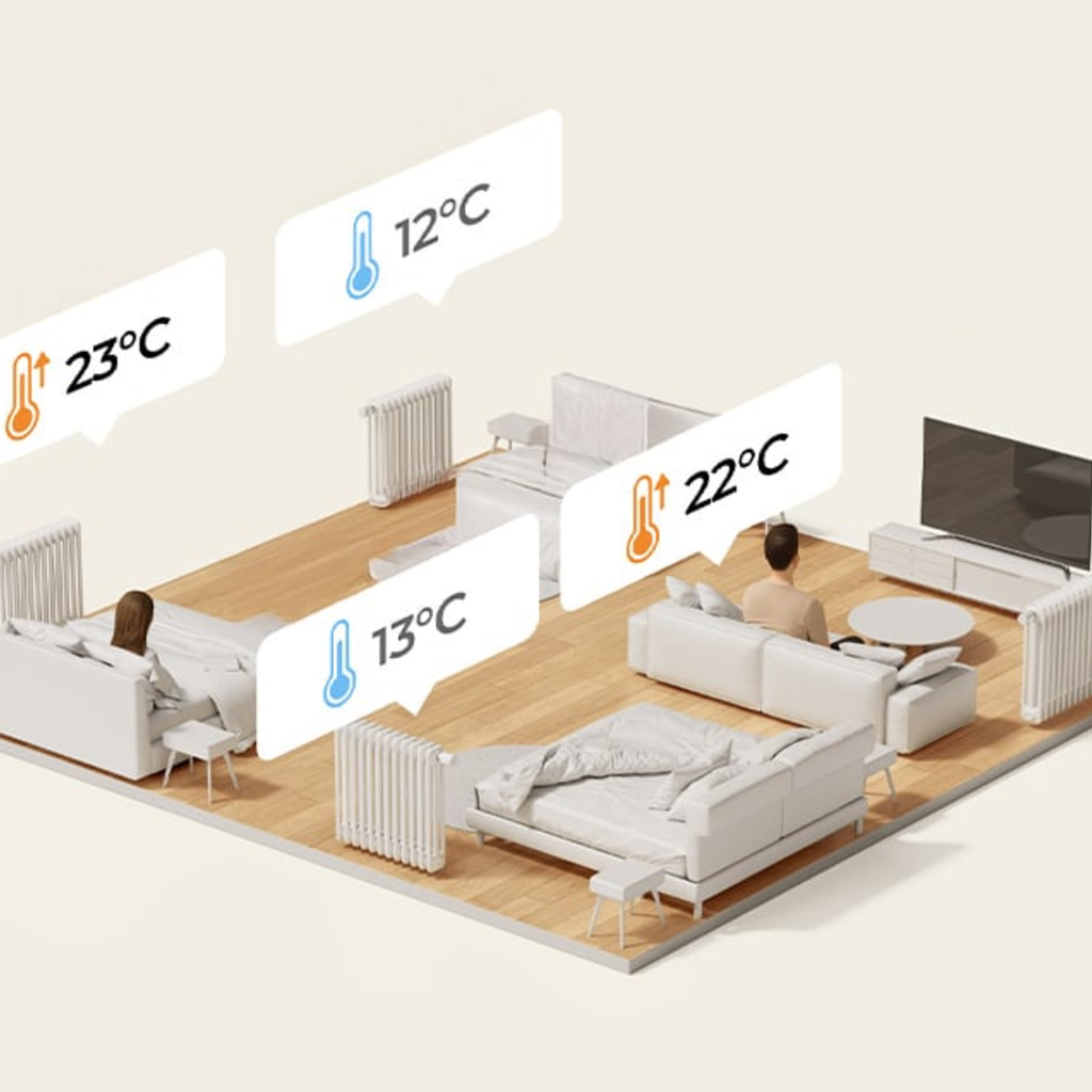 A SwitchBot termosztát lehetővé teszi, hogy különböző szobákban különböző hőmérsékletet állítson be. A gyerekek korán jönnek haza? Az ő szobájuk a megfelelő időben meleg lesz. A hálószobának csak alacsonyabb hőmérsékletre van szüksége, a kamra pedig egész nap hűvös maradhat. Így a család minden tagjának ideálisak a körülmények, és nem pazarolja az energiát ott, ahol nincs szükség fűtésre. A rendszer több, egyetlen összefüggő hőmérséklet-szabályozó rendszerré egyesített fejek alapján működik.
