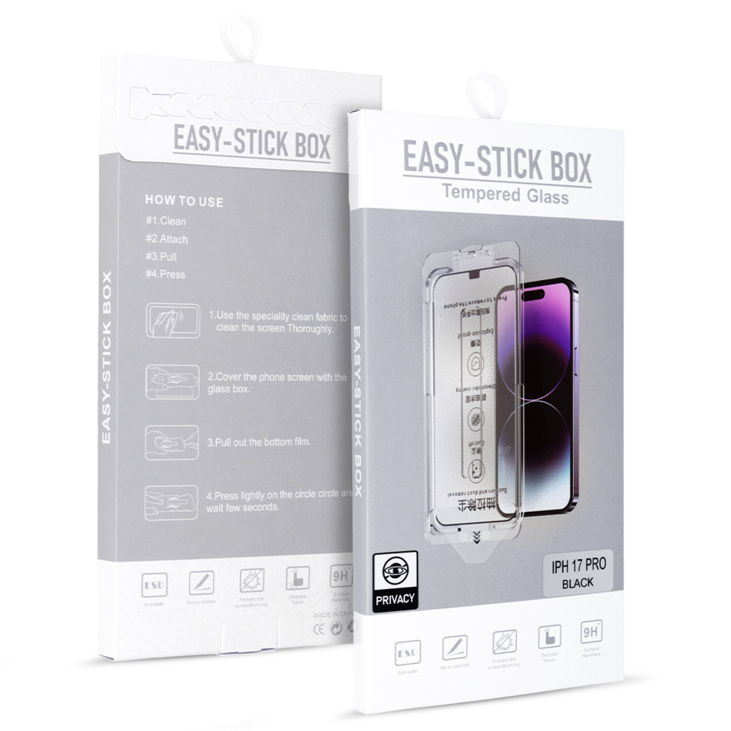 Teljes ragasztós privacy üvegfólia Easy-Stick Box iPhone 17 Air fekete üvegfólia