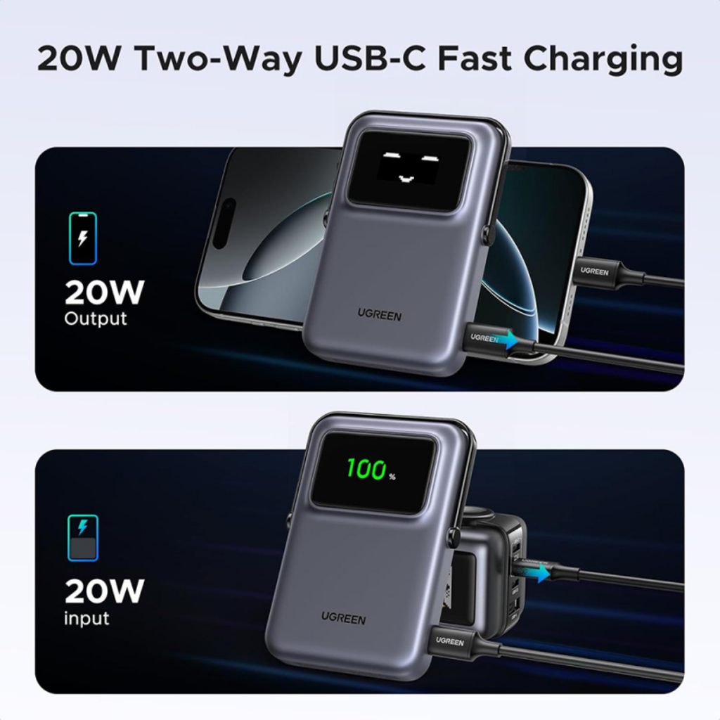 - TFT okos kijelző hangulatjelekkel: Az UGREEN PB764 Uno egyedi "robot" arckijelzője több mint 15 különböző hangulatjellel és a pontos töltöttségi százalékkal (pl. 89%) jelzi a powerbank aktuális állapotát, vizuálisan és játékosan kommunikálva veled.