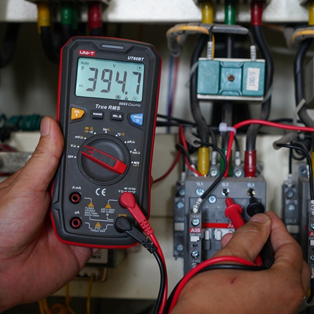 Az UNI-T UT60BT digitális multiméter egy fejlett mérőeszköz, amely egyesíti a funkcionalitást, a pontosságot és a kényelmet. True RMS méréseket, 9999-es számolási felbontást és érintésmentes feszültségérzékelést kínál. Az UT60BT 1000 V-ig képes AC/DC feszültséget, 10 A-ig AC/DC áramot, 100 MΩ-ig ellenállást, valamint a hőmérsékletet, az üzemi ciklust, a diódákat és az áramkör folytonosságát mérni. A készülék Bluetooth, tartás funkcióval, háttérvilágítású kijelzővel, háromszínű LED kijelzővel és relatív üzemmóddal rendelkezik. Támogatja az automatikus és a kézi tartományválasztást is, az alacsony töltöttségi szintet pedig egy megfelelő ikon jelzi. A multiméter megfelel a CE, UKCA és cETLus biztonsági szabványoknak, masszív, dupla fröccsöntött háza pedig tartósságot és kényelmet biztosít.