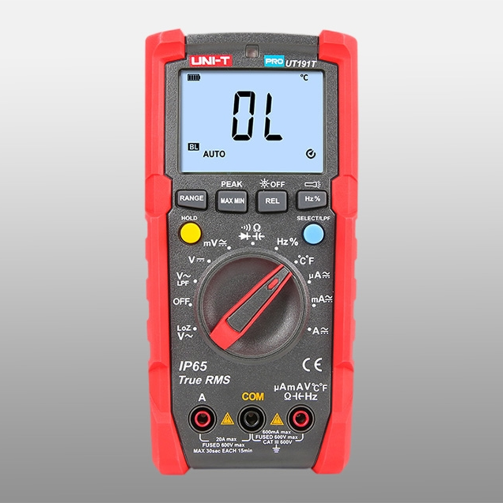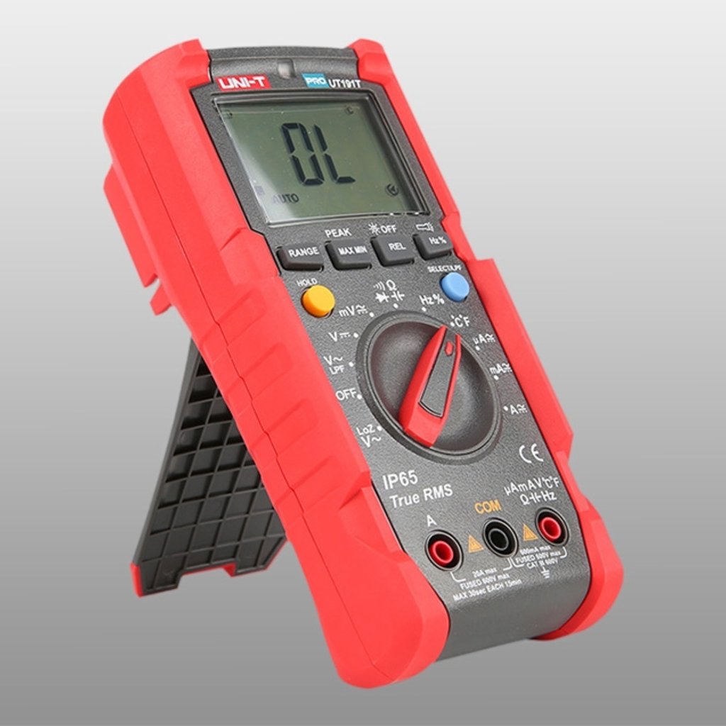 Az UNI-T UT191T egy professzionális digitális multiméter, amelyet zord ipari környezetben való használatra terveztek. A True RMS funkcióval felszerelt mérőműszer pontos feszültség-, áram-, ellenállás-, kapacitás-, frekvencia- és hőmérséklet-méréseket biztosít. Az UT191T 6000-es felbontást és automatikus vagy kézi tartományválasztást kínál. A mérő háza megfelel az IP65 szabványnak, és akár 2 méteres magasságból történő leejtést is kibír, így ideális eszköz a zord és változó körülmények között történő használatra.
