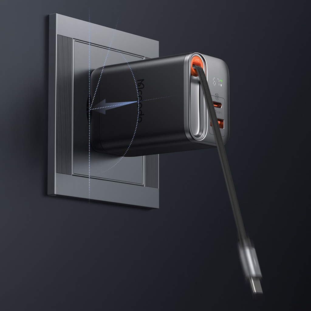 A McDodo CH-4100 lenyűgöző, akár 67 W töltési teljesítményt kínál az USB-C porton keresztül, így képes gyorsan tölteni laptopokat, táblagépeket és okostelefonokat. Másrészt a 65 cm hosszú beépített USB-C kábel akár 60 W-tal történő töltést támogat, míg az USB-A port 30 W-tal támogatja a töltést. Továbbá, az intelligens energiamenedzsmentnek köszönhetően a töltő automatikusan igazítja a teljesítményt a csatlakoztatott eszközök számához, biztosítva az optimális töltést.