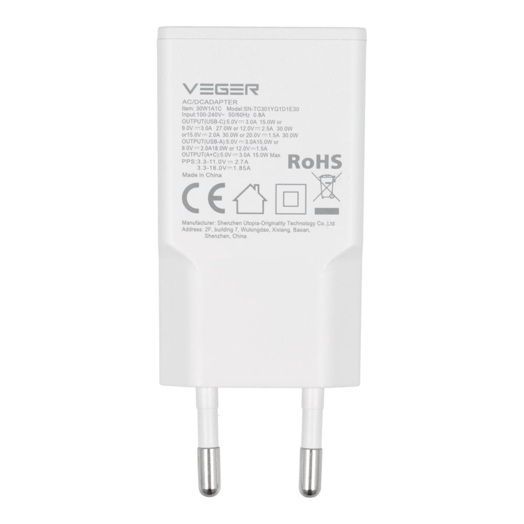 VEGER fali töltő USB A + USB C QC PD 30W 30W1A1C fehér