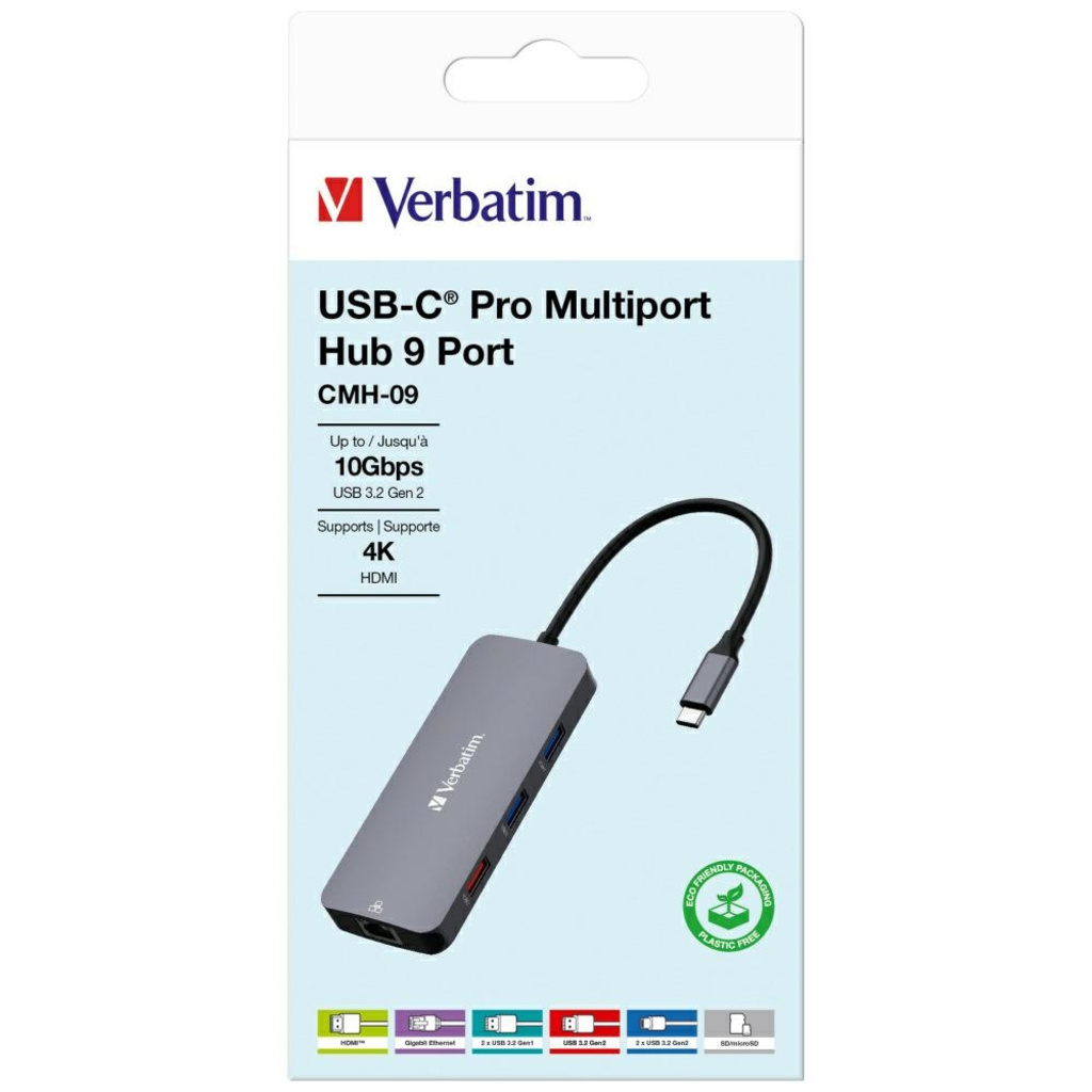 A Verbatim adapter kilenc sokoldalú portot kínál különböző USB-C és USB-A generációk támogatásával, így biztosítva a maximális kompatibilitást a készülékekkel. Élvezd a 4K videó minőséget a HDMI porton keresztül, használd a gyors vezetékes internetkapcsolatot a Gigabit Ethernet porttal, és másold át fotóidat és adataidat könnyen és gyorsan az SD és microSD kártyahelyek segítségével. Az adapter két USB-C porttal és egy USB-A porttal rendelkezik, amely akár 10 Gb/s sebességet is támogat, valamint két USB-A porttal, amelyek akár 5 Gb/s sebességet nyújtanak, így kiváló csatlakoztathatósági lehetőségeket biztosítanak.