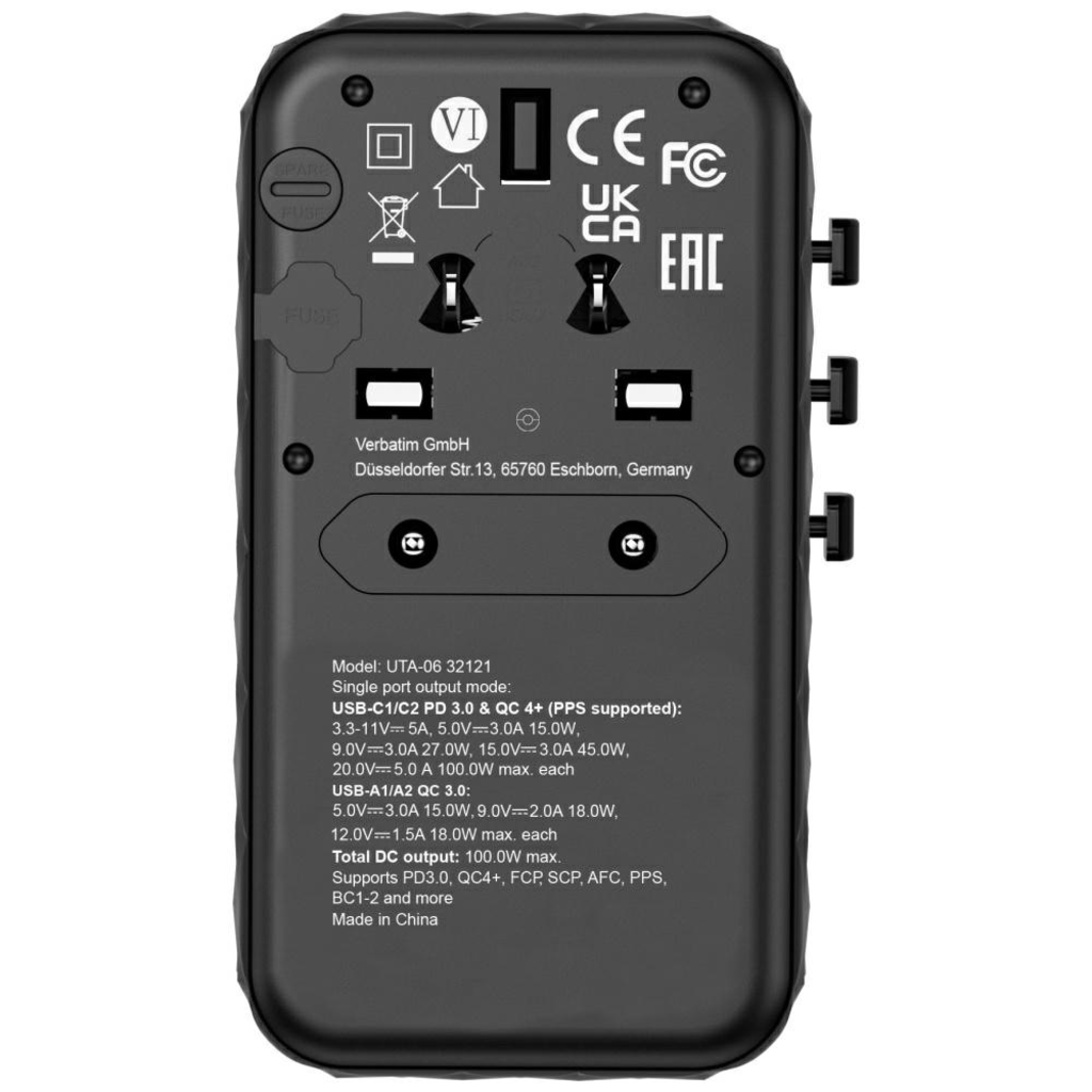 A Verbatim adapter megfelel az FCC, UKCA, CE és ROHS tanúsítványoknak, valamint kiváló minőségű lángálló polikarbonát anyagból készült, így ideális eszköz a mindennapi használatra utazás közben. Gyermekbiztos zsalukkal van felszerelve, amelyeket csak 75N (7,5 kg) erő felett lehet kinyitni lyukanként, valamint egy BS1362 szabványú biztosítékkal (tartalék biztosítékot is tartalmaz), így teljes biztonságot nyújt, bárhol is legyen.