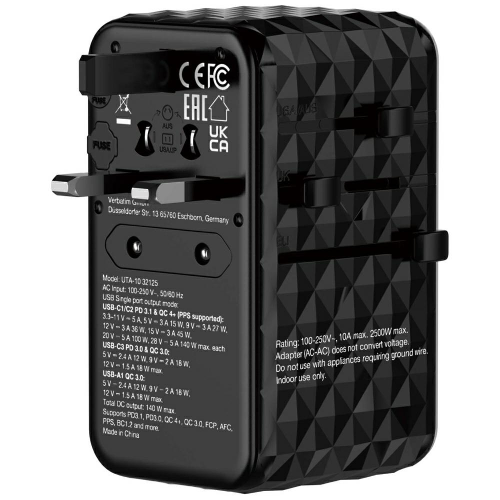 Verbatim UTA-10 GaN USB-A/3xUSB-C PD 140W Utazó Adapter fekete