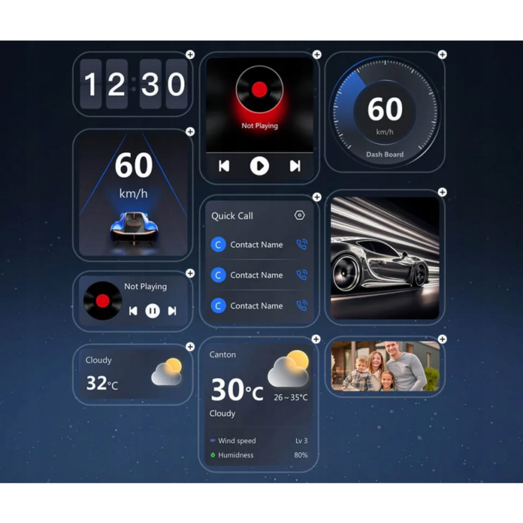 Játssz le filmeket, sorozatokat és videókat közvetlenül az autód képernyőjén a telepíthető alkalmazásoknak és a 256 GB-ig bővíthető TF kártya támogatásnak köszönhetően. Az adapter igazi mini TV-boxszá válik az autóban – ideális megoldás az utasoknak hosszú utazások során, vagy ha éppen várakoznod kell valahol. A testre szabható widgetekkel a fontos információk mindig szem előtt vannak, akár időjárás, sebesség vagy gyorshívás.