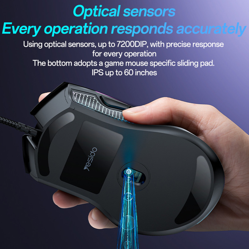 A Yesido KB20 gamer egér nagy pontosságú optikai szenzorokkal van felszerelve, amelyek garantálják, hogy minden mozdulat pontosan és azonnal reagál. Az állítható DPI tartomány 1000 és 7200 között mozog, lehetővé téve, hogy a játékstílusodhoz vagy az aktuális feladathoz igazítsd az érzékenységet. Az egér alja speciális játék egér alátéttel van ellátva a sima és pontos csúszás érdekében.