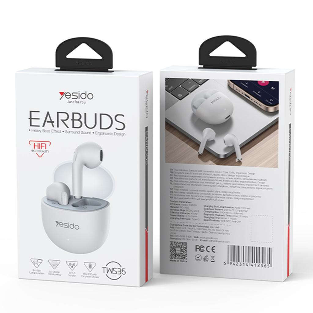 Az ergonomikus, fél-fülbe helyezhető kialakításnak köszönhetően a Yesido TWS35 fülhallgatók egész nap kényelmesen viselhetők. Könnyűek és diszkrétek, tökéletesen illeszkednek a füléhez anélkül, hogy nyomást gyakorolnának, így hosszú órákon át élvezheti a zenét vagy a beszélgetéseket fáradtság nélkül.
