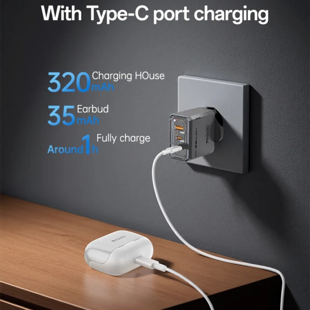 - Gyors töltés Type-C porton keresztül: Mindössze körülbelül 1 óra alatt teljesen feltölthető a töltőtok, a modern Type-C csatlakozónak köszönhetően.